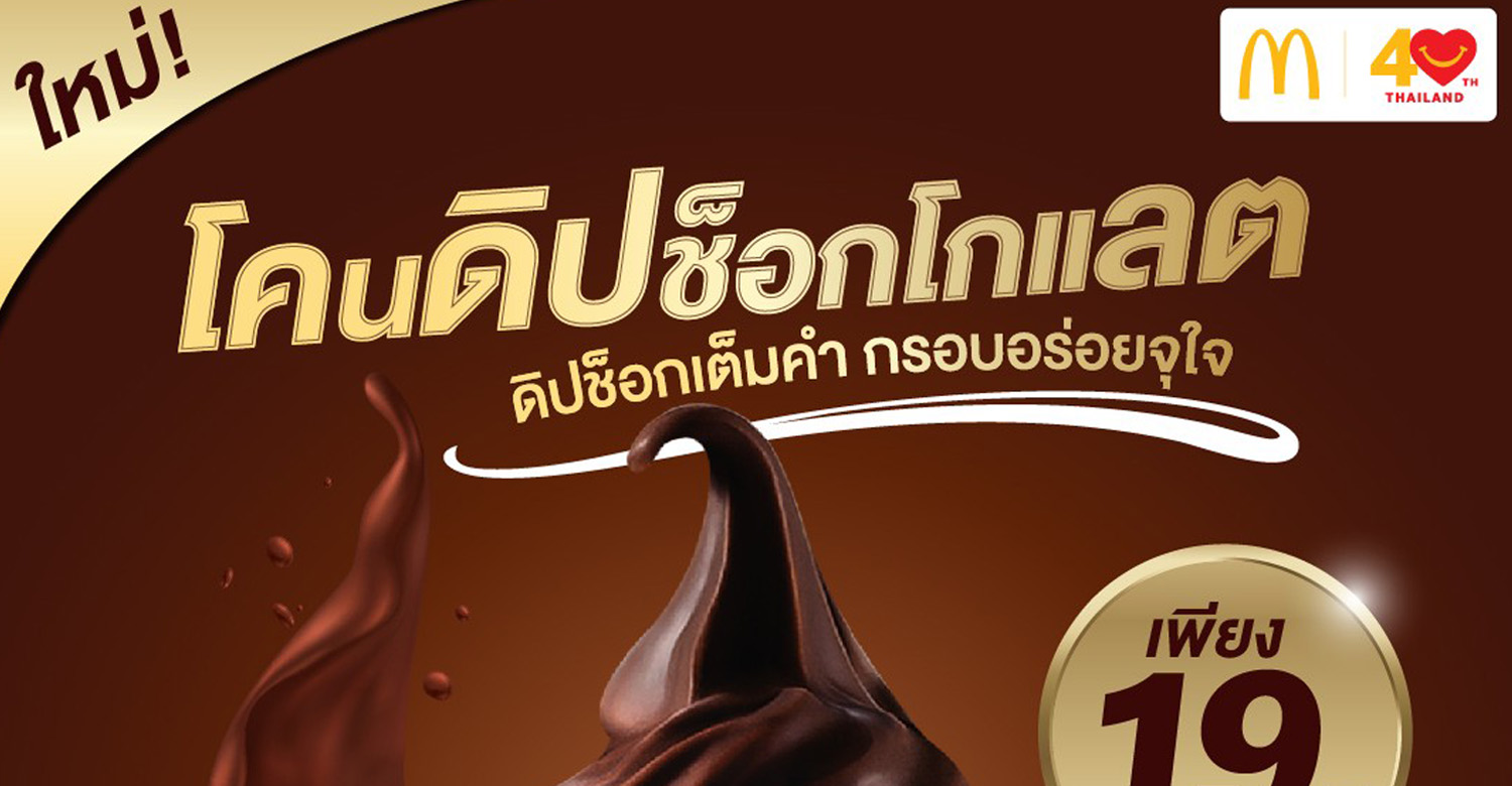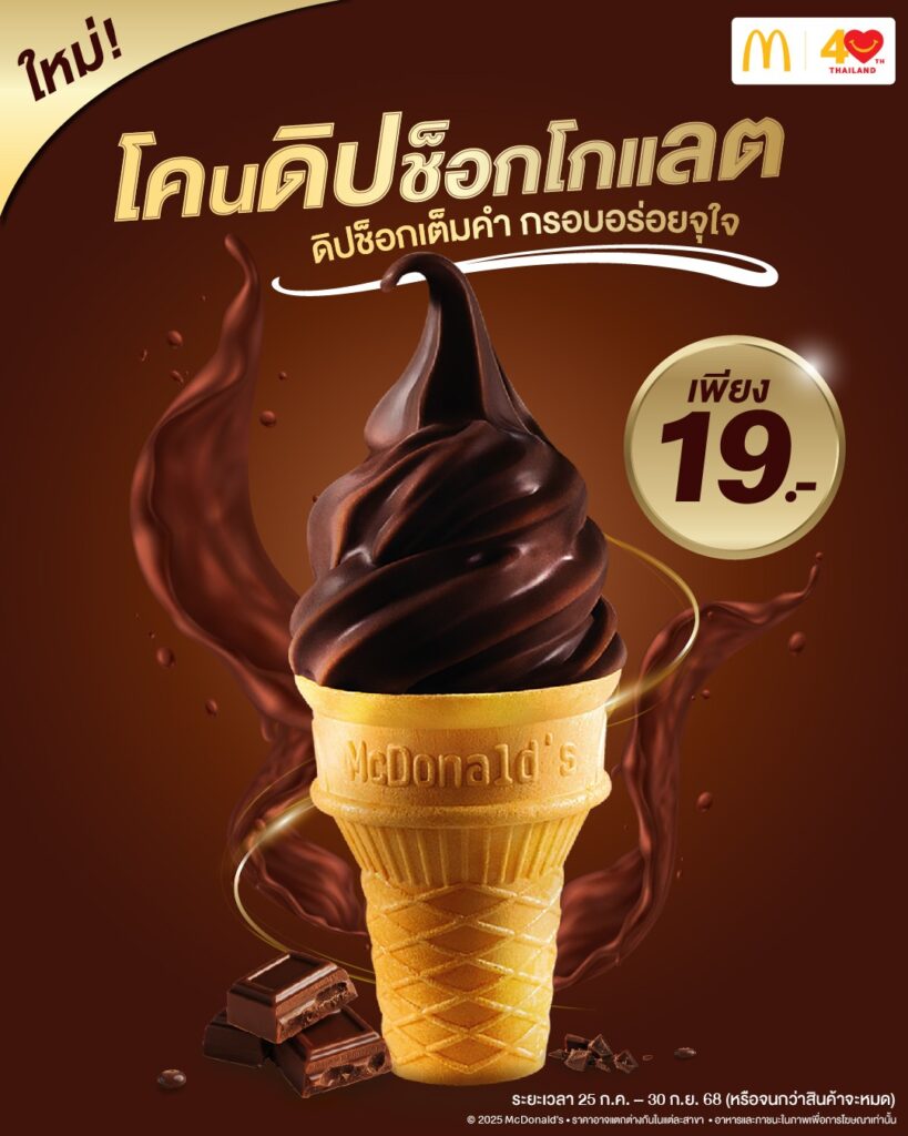 มาลิ้มลองความหวานฉ่ำ อร่อยเข้มๆ กับช็อกโกแลตจุใจ ‘โคนดิปช็อกโกแลต’ ได้แล้วตั้งแต่วันนี้ถึง 30 กันยายน 2568 ที่ร้านแมคโดนัลด์ทุกสาขาที่ร่วมรายการ และ บริการแมคไดร์ฟ ทรู ติดตามรายละเอียดเพิ่มเติมได้ที่ Facebook.com/McThai