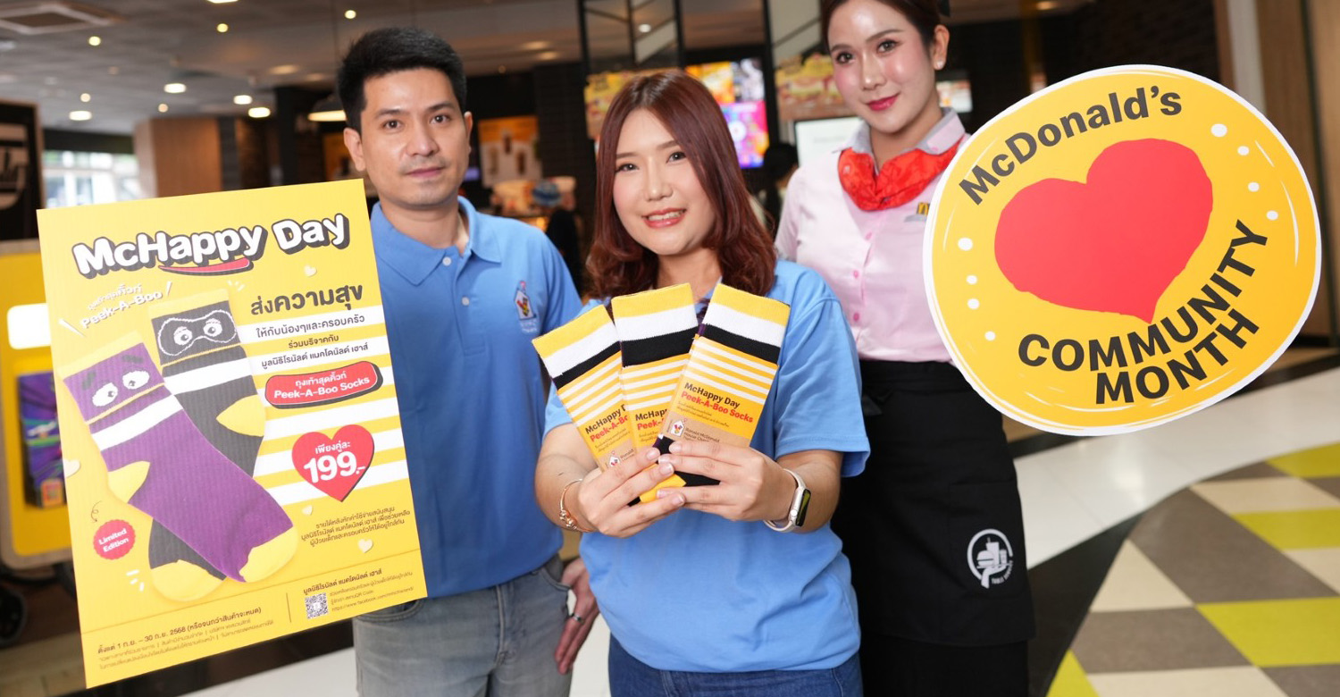 แมคโดนัลด์ ชวนสร้างสังคมแห่งการให้ในเดือนจิตอาสา (Community Month) พร้อมส่งพลังใจให้น้องๆ ผู้ป่วยเด็กและครอบครัว กับแคมเปญ ‘McHappy Day’ เพื่อร่วมสนับสนุนมูลนิธิโรนัลด์ แมคโดนัลด์ เฮาส์ ประเทศไทย ด้วยถุงเท้า ‘Peek-A-Boo Socks’ รุ่นลิมิเต็ดที่ไม่เหมือนใคร ในลายคาแรกเตอร์สุดฮิต Grimace และ Hamburglar ราคาเพียงคู่ละ 199 บาทเท่านั้น!