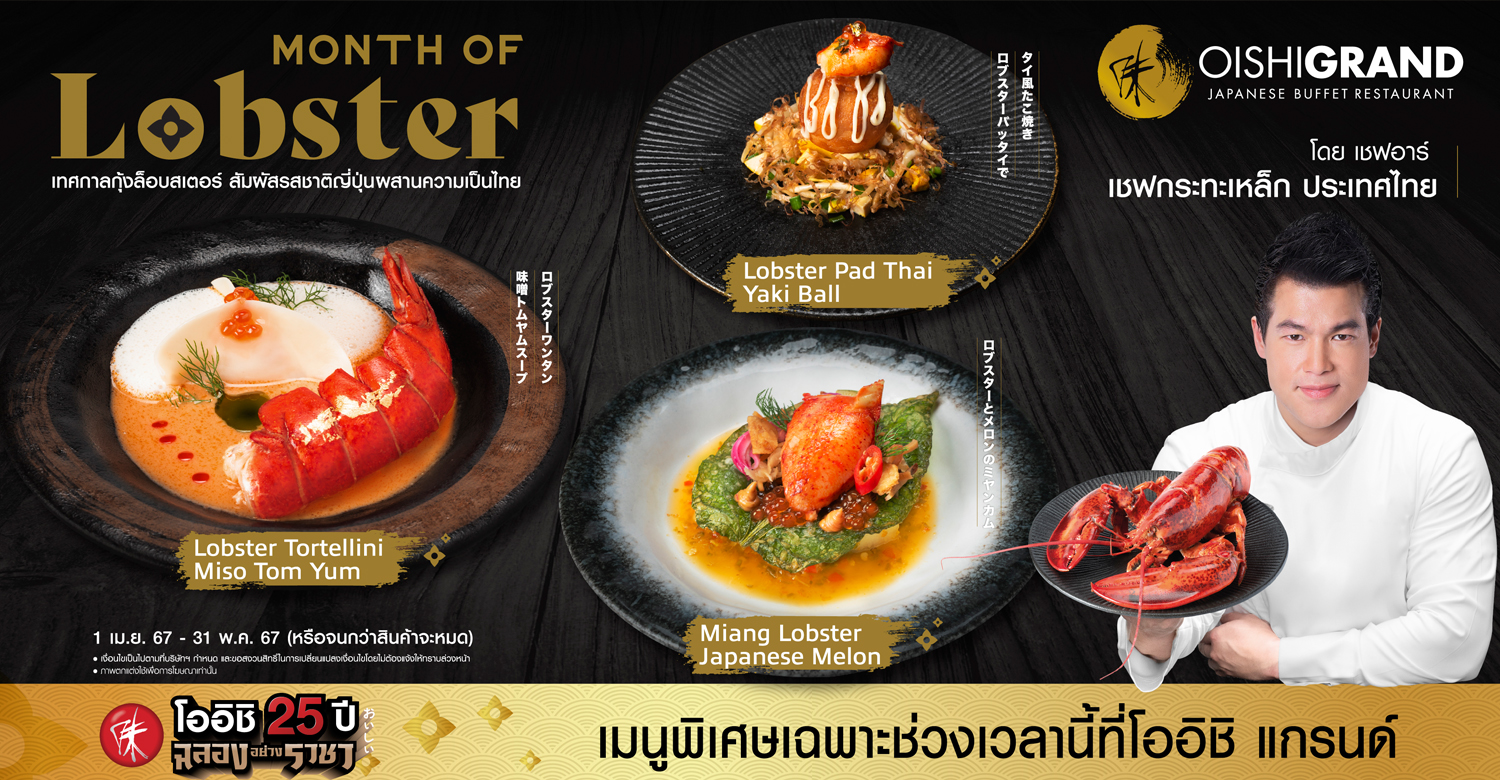 อิ่ม โอ-ร่อย เทศกาล “MONTH OF LOBSTER” พร้อมเมนูใหม่ในธีม “EAT LIKE A KING” ขอแนะนำ สารพัดเมนูล็อบสเตอร์ แบบฉบับ เชฟอาร์ เชฟกระทะเหล็ก ประเทศไทย ได้แก่ “Miang Lobster Japanese Melon” (เมี่ยงล็อบสเตอร์เมลอนญี่ปุ่น) เสิร์ฟเนื้อล็อบสเตอร์ชิ้นโต เต็มปากเต็มคำ คู่ใบชะพลูเทมปุระกรอบ ๆ และเมลอนญี่ปุ่น ในน้ำซอสสูตรพิเศษ…เปรี้ยวอมหวาน ตามสไตล์เมี่ยงแบบไทย เป็นรสชาติที่สุดแสนจะลงตัว “Lobster Pad Thai Yaki Ball” (ยากิบอลล็อบสเตอร์ผัดไทย) เมนูที่ผสมผสานระหว่างเครื่องผัดไทย ปรุงรสชาติกลมกล่อม กับแป้งทาโกะยากิบอลย่างหอมกรุ่น รับประทานพร้อมเนื้อล็อบสเตอร์ เนื้อแน่น…เด้ง เป็นอีกขั้นของความอร่อยที่ต้องลิ้มลอง และ Lobster Tortellini Miso Tom Yum” (ล็อบสเตอร์ทอร์เทลลินี ซุปมิโซะต้มยำ) คัดสรรล็อบสเตอร์ เทล ชิ้นโต เนื้อแน่น…หวาน เป็นเอกลักษณ์ มาเสิร์ฟเข้าคู่กับทอร์เทลลินี (หรือพาสต้าสอดไส้) พร้อมน้ำซุปสูตรพิเศษ ผสานเครื่องต้มยำ รสชาติจัดจ้าน และมิโซะ (หรือเต้าเจี้ยวญี่ปุ่น) เพิ่มกลิ่นและรสสัมผัสให้ยิ่งละมุน