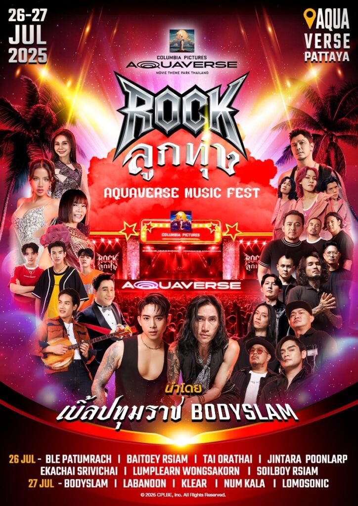 ‘ลูกทุ่ง & Rock Aquaverse Music Fest’ จะเป็นเทศกาลดนตรีสุดยิ่งใหญ่ในพัทยา จัดกลางสระคลื่นเทียมที่ใหญ่ที่สุดในประเทศไทย พร้อมไลน์อัพศิลปินชื่อดังมากมาย ในวันที่ 26 กรกฎาคม 2568 พบศิลปินลูกทุ่งตัวท้อปนำโดย เบิ้ล ปทุมราช เจ้าของเพลง ‘อ้ายมีเหตุผล’ พร้อมเหล่าศิลปินที่ขนเพลงฮิตมาโชว์แบบไม่มียั้ง ได้แก่ ใบเตย อาร์สยาม ต่าย อรทัย ลำเพลิน วงศกร จินตหรา พูนลาภ เอกชัย ศรีวิชัย และซอยบอย น้องเล็กแห่งอาร์สยาม สำหรับคอเพลงร็อก ห้ามพลาดโชว์สุดมันในวันที่ 27 กรกฎาคม 2568 ปล่อยพลังกับเพลงสุดเดือดจากวงร็อกระดับตำนาน ได้แก่ บอดี้สแลม ลาบานูน เคลียร์ หนุ่ม กะลา และโลโมโซนิก
