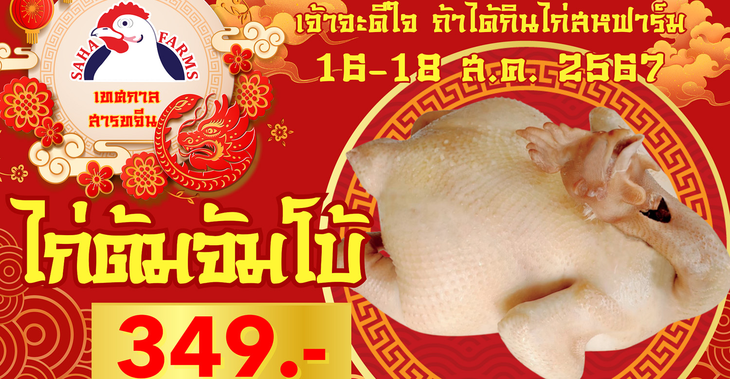 สหฟาร์มชวนไหว้สารทจีนปี 2024 พบกับชุดของไหว้มงคลคุณภาพชั้นเลิศสดใหม่จากฟาร์ม ในราคาสบายกระเป๋า ทั้งไก่สดไหว้เจ้า แม่ไก่สด แม่ไก่ต้มไหว้เจ้า น้ำหนัก 4 กก. ขึ้นไป นอกจากนี้ยังมีเป็ดสด เป็ดพะโล้ ผักสดและผลไม้ ดอกไม้ คัดสรรคุณภาพที่ดี รวมทั้งขนมเทียน ขนมเข่ง ขนมปุ้ยฝ้าย ผลิตใหม่สด เพื่อเทศกาลสารทจีน ในราคาสุดพิเศษจากฟาร์มส่งตรงถึงลูกค้า ใครกำลังจับจ่ายหาของไหว้เชิญได้ที่สหฟาร์ม ซูเปอร์มาร์เก็ต ถนนรามอินทรา ตั้งแต่วันที่ 16 – 18 สิงหาคมนี้ หรือสามารถสั่งจองได้ที่ โทร. 089-636-4654 รับรองปีนี้เจ้าจะดีใจที่ได้กินไก่ สหฟาร์ม