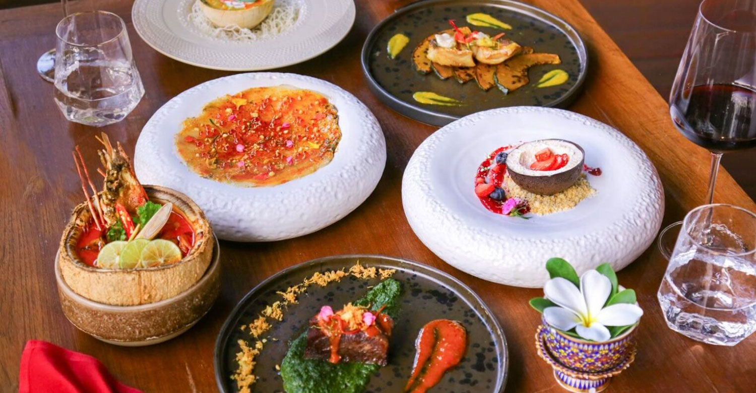 เชตเมนู 5 คอร์ส เริ่มด้วย ห่อหมกทะเล ที่มีความหอมมันจากกะทิ พร้อมซีฟู้ดสดจากสุราษฎร์ธานี เชฟเลือกเสิร์ฟในลูกมะพร้าวขนาดเล็ก เมื่อรับประทานร่วมกับเนื้อมะพร้าวอ่อน จะช่วยเพิ่มมิติให้กับรสชาติและลดความเผ็ดร้อนของเครื่องแกง จากนั้นตามด้วย Samui Lobster Carpaccio ซึ่งเป็นเมนูเรียกน้ำย่อยที่จับคู่ความหวานฉ่ำของล็อบสเตอร์สดจากเกาะสมุยเข้ากับคาเวียร์รสต้มยำรสจัดจ้าน เพิ่มสัมผัสกรุบกรอบด้วยแครกเกอร์ถั่วลิสง ด้านเมนูซุปพลาดไม่ได้กับ ต้มยำกุ้ง ซึ่งแตกต่างจากสูตรดั้งเดิมด้วยการใช้น้ำมะพร้าวอ่อนมาเป็นเบส ทำให้ได้รสละมุน