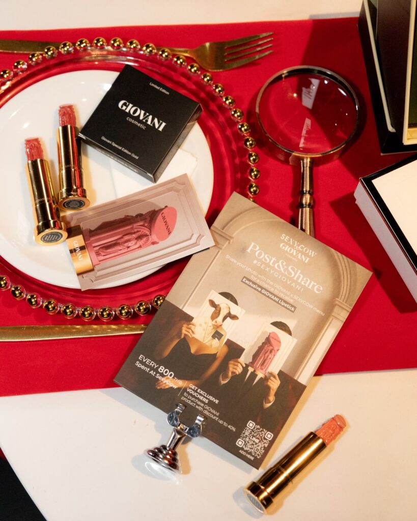 การโคจรมาพบกันของสองแบรนด์จากสองโลกอย่าง SEXY COW Prime Steak & Seafood และ GIOVANI Cosmetic ในแคมเปญ ‘Empower Your Sexy Confidence’ มากกว่าคำว่า Collaboration นี่คือการผสานสองศิลปะอันแตกต่าง แต่มีหัวใจเดียวกันคือศิลปะแห่งการลิ้มรสกับศิลปะแห่งความงาม เพื่อร่วมกันส่งต่อสารอันทรงพลังว่า “ความมั่นใจ คือเสน่ห์ที่แท้จริง” ไม่ว่าคุณจะยืนอยู่หน้ากระจก หรือกำลังนั่งอยู่ที่โต๊ะอาหาร จากลิปสติกที่งดงามประหนึ่งประติมากรรม ไปจนถึงจานสเต็กที่รังสรรค์อย่างพิถีพิถัน ทุกองค์ประกอบถูกออกแบบเพื่อปลุกพลังภายใน ให้ผู้หญิงทุกคนได้เฉิดฉายในแบบของตัวเองอย่างสง่างาม