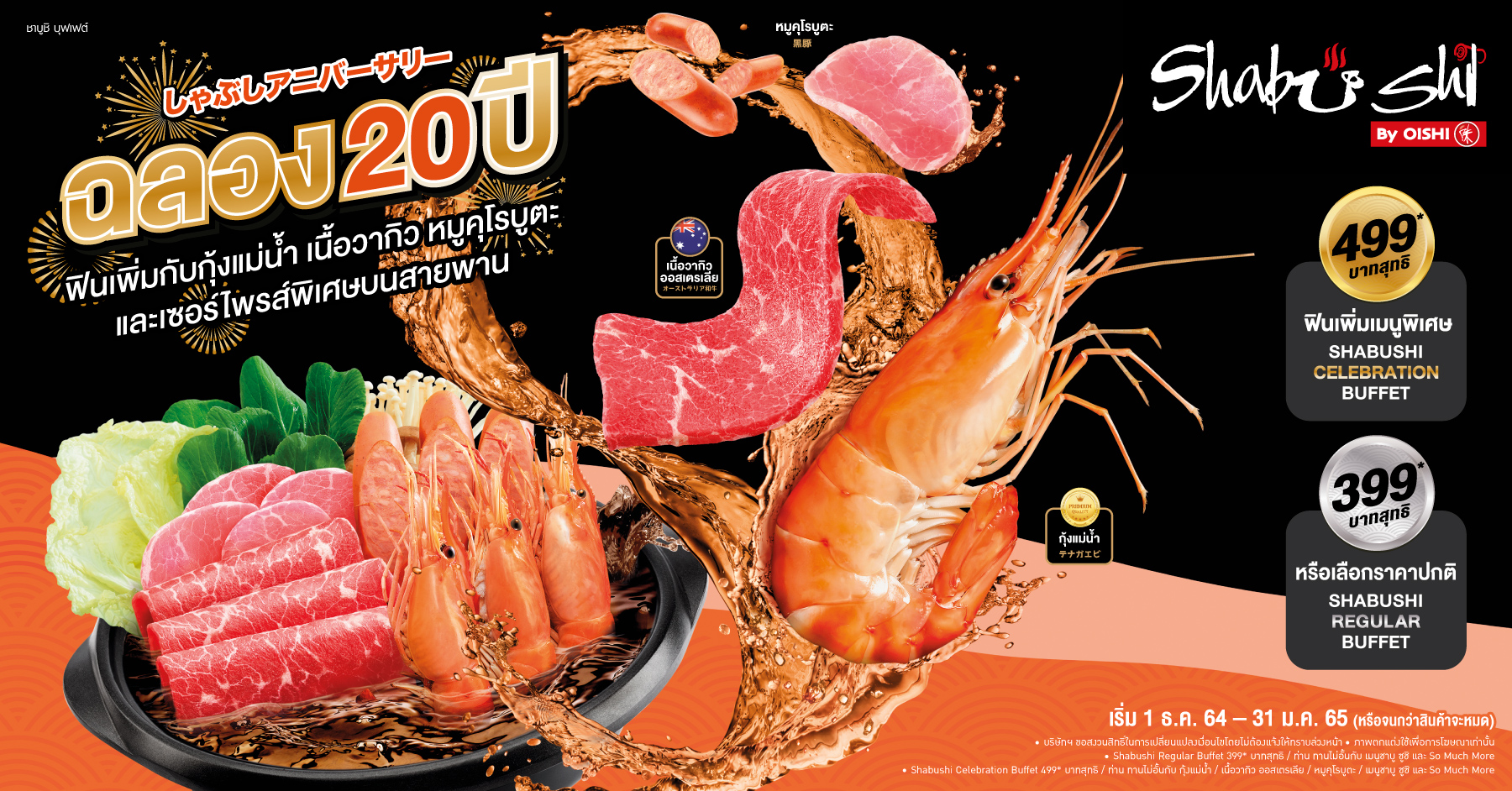 “ชาบูชิ” ฉลองครบรอบ 20 ปี ขอแนะนำความพิเศษผ่านชุด “SHABUSHI CELEBRATION BUFFET” 499* พร้อมยกระดับความฟินขึ้นไปอีกขั้น ด้วยนานาวัตถุดิบพรีเมียม คุณภาพ สดใหม่ ที่คอชาบู – ชาบู ต่างถามหาและเรียกร้องมากที่สุด เมนูพิเศษนำโดย “กุ้งแม่น้ำ” คัดขนาดตัวโต ๆ เนื้อสัมผัสเด้ง หวาน “เนื้อวากิวออสเตรเลีย” เนื้อวัวคุณภาพเยี่ยมนำเข้าจากออสเตรเลีย ลายเนื้อไขมันแทรก สัมผัสนุ่ม ละมุน
