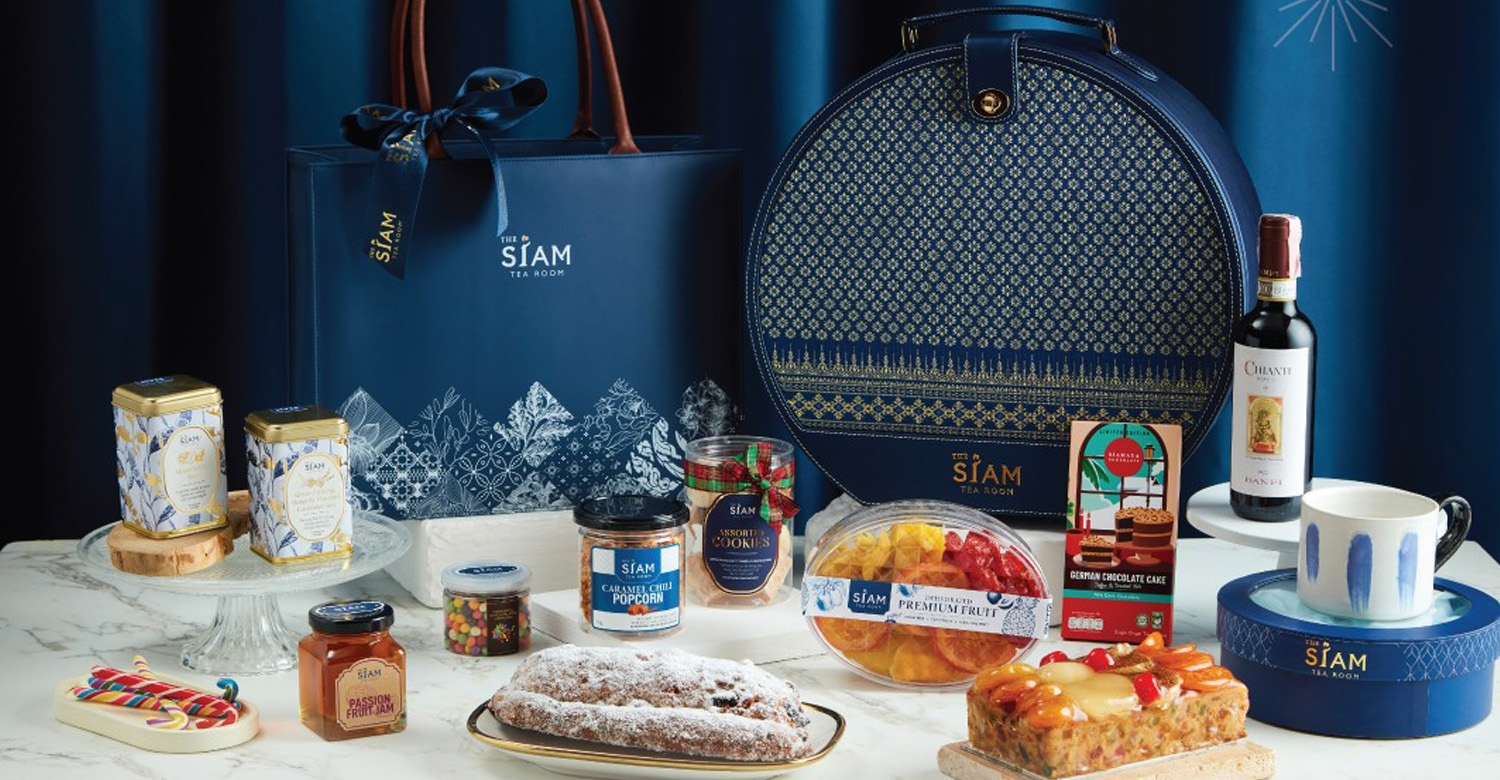 กระเช้าชุดนี้รวมขนมประจำฤดูกาลแบบดั้งเดิม อาทิ เค้กผลไม้สไตล์อังกฤษ, คริสต์มาสสโตลเลน, คริสต์มาสคุกกี้หลากชนิด, ผลไม้อบแห้งระดับพรีเมียม, เค้กช็อกโกแลตสไตล์เยอรมันจาก Siamaya, ลูกกวาดรูปไม้เท้า, แยมเสาวรสพรีเมียม และป๊อปคอร์นคาราเมลพริก พร้อมด้วยชาจากเดอะ สยาม ที รูมท์ และแก้วรักษ์โลกผลิตจากเปลือกหอยนางรม รวมถึงไวน์แดงอิตาลี Banfi Chianti DOCG ขนาด 375 มิลลิลิตร จัดมาในกระเป๋าถือทรงกลมสุดหรู