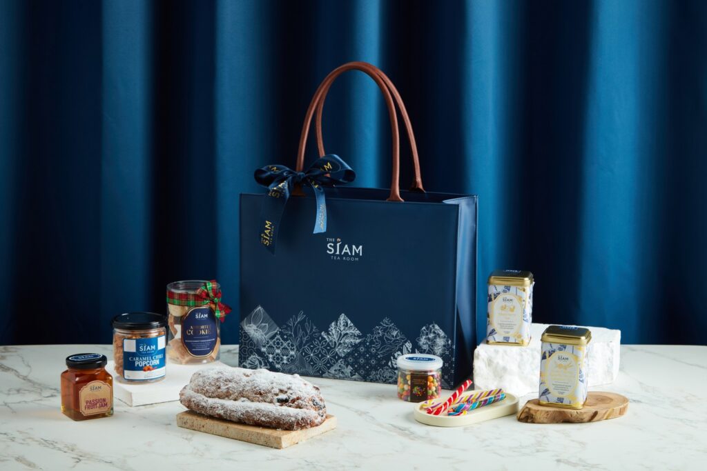 ภายในประกอบด้วยขนมประจำฤดูกาล ไม่ว่าจะเป็นคริสต์มาสสโตลเลน, คริสต์มาสคุกกี้หลากชนิด, ลูกกวาดรูปไม้เท้า, ข้าวพองช็อกโกแลตเรนโบว์นำเข้าจากฝรั่งเศส, แยมเสาวรสพรีเมียม และป๊อปคอร์นคาราเมลพริก มาพร้อมชาจากเดอะ สยาม ที รูมท์ บรรจุในกระเป๋าดีไซน์ร่วมสมัย เหมาะอย่างยิ่งสำหรับเป็นของขวัญแด่คนพิเศษ