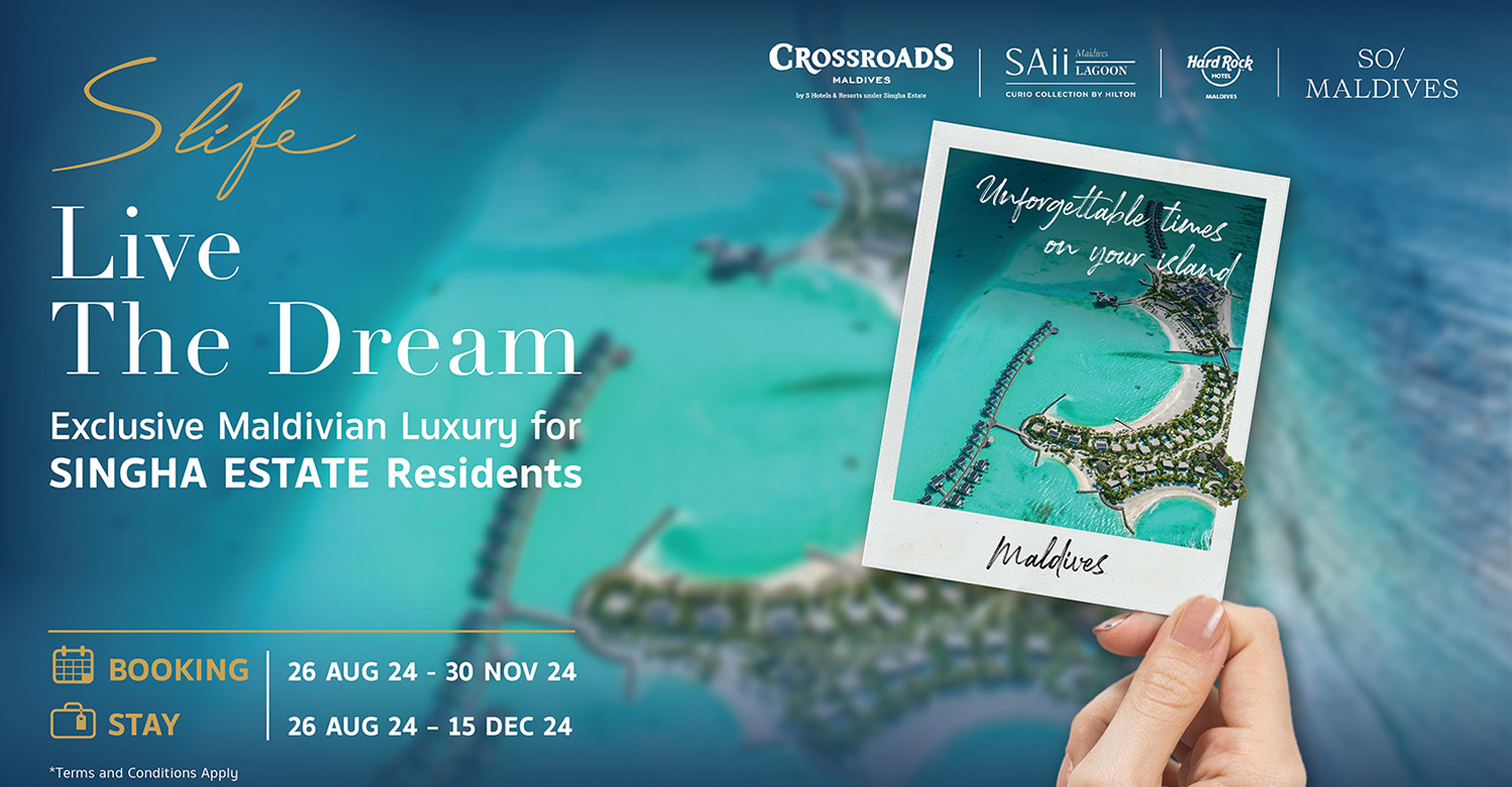 บริษัท สิงห์ เอสเตท จำกัด (มหาชน) (SET: S) ตอกย้ำความแข็งแกร่ง 10 ปี แห่งการเป็นผู้นำด้านการพัฒนาอสังหาริมทรัพย์เซกเมนต์ลักชูรี่ ด้วยการมอบเอกสิทธิ์เฉพาะลูกบ้านอย่างต่อเนื่อง ผ่านแคมเปญ “S Life” เติมเต็มประสบการณ์อันล้ำค่าและน่าจดจำกับโปรแกรม “Live The Dream” ให้คุณได้ใช้ชีวิตได้ตามฝันบนเกาะส่วนตัวที่ CROSSROADS Maldives แหล่งท่องเที่ยวครบวงจรที่ได้รับการยอมรับในระดับโลก สัมผัสการพักผ่อนระดับลักชูรี่กับห้องพักและการบริการจาก 3 รีสอร์ตชั้นนำในเครือสิงห์ เอสเตท ได้แก่ “ทราย ลากูน มัลดีฟส์” (SAii Lagoon Maldives), “ฮาร์ดร็อค โฮเทล มัลดีฟส์” (Hard Rock Hotel Maldives), และ”โซ มัลดีฟส์” (SO/ Maldives) ท่ามกลางความงดงามของธรรมชาติ ที่จะทำให้คุณตื่นมาพบแสงพระอาทิตย์แรกยามเช้าเหนือน้ำทะเลสีคริสตัล เพลิดเพลินกับกิจกรรมระหว่างวัน ทั้งการดำดิ่งสู่โลกใต้ท้องทะเลที่มีชีวิตชีวา การผ่อนคลายบนชายหาดส่วนตัว ปิดท้ายด้วยค่ำคืนอันสมบูรณ์แบบด้วยดินเนอร์ใต้แสงดาวสุดโรแมนติก