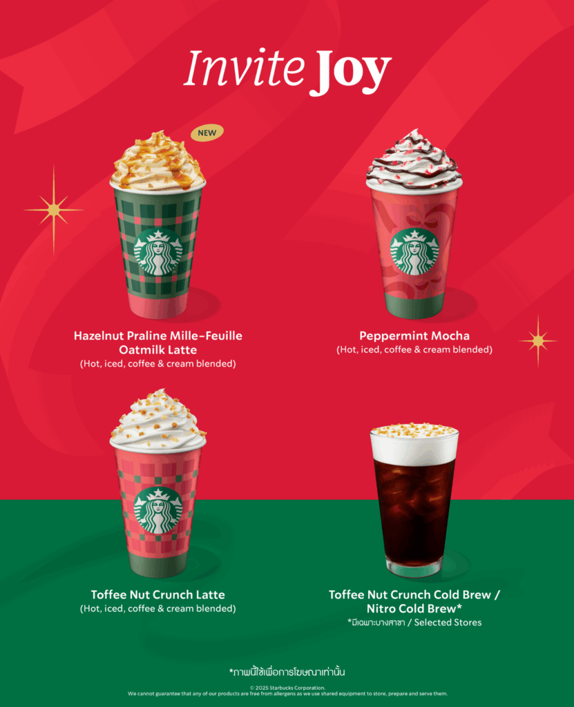 สตาร์บัคส์ ประเทศไทย เสิร์ฟความอร่อยช่วงเทศกาลคริสต์มาสที่กำลังจะมาถึงด้วยเมนูเครื่องดื่มและของว่างสุดพิเศษ ตั้งแต่วันที่ 4 พฤศจิกายน 2568 ถึง 5 มกราคม 2569 ที่ร้านสตาร์บัคส์ทุกสาขาทั่วประเทศ
