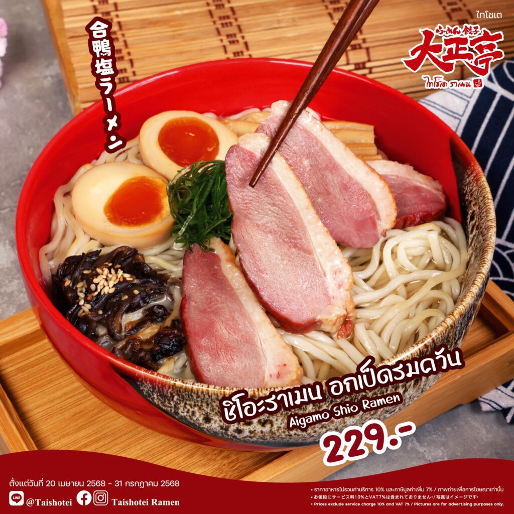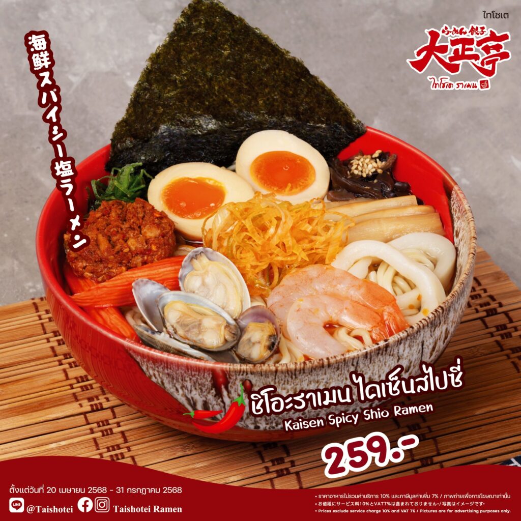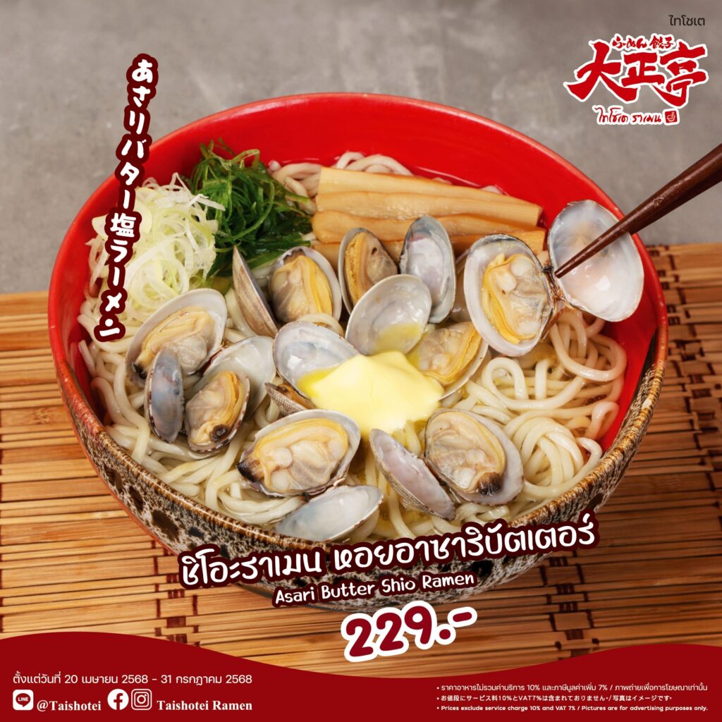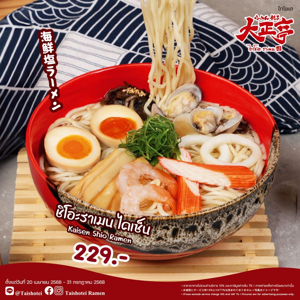 “ไทโชเต” ร้านราเมนต้นตำรับญี่ปุ่น ขอแนะนำเมนูเด่น “Shio Ramen” ราเมนรสนุ่มกลมกล่อมในน้ำซุปเกลือสูตรพิเศษ พร้อมเลือกอร่อยได้ถึง 5 สไตล์ ได้แก่ 1. ชิโอะราเมน หอยอาซาริบัตเตอร์ 2.ชิโอะราเมน ไคเซ็น 3.ชิโอะราเมน ไคเซ็นสไปซี่ 4.ชิโอะราเมน อกเป็ดรมควัน และ 5. ชิโอะราเมน อกเป็ดรมควันสไปซี่ ทุกเมนูราคาเพียง 229 บาท พร้อมให้บริการถึงวันที่ 31 กรกฎาคม 2568 ณ ร้านไทโชเต ชั้น 1 โซนฟู้ดเอเทรี่ยม อาคารชาเลนเจอร์ 3 อิมแพ็ค เมืองทองธานี เปิดบริการทุกวัน เวลา 11.00 – 20.00 น.