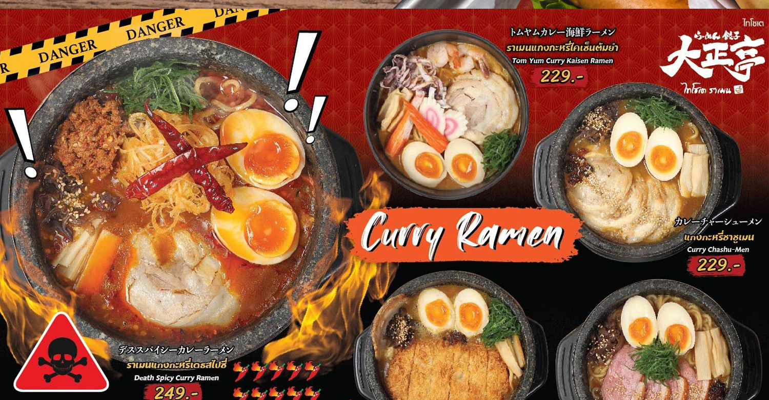 ราเมนแกงกะหรี่สไตล์ญี่ปุ่น 5 เมนูใหม่จากร้านไทโชเต ได้แก่ “แกงกะหรี่ชาชูเมน” ราคา 229 บาท “ราเมนแกงกะหรี่เป็ดรมควัน” ราคา 239 บาท กับน้ำซุปรสชาติเข้มข้นถึงใจ เส้นราเมนเหนียวนุ่ม และเนื้อเป็ดชั้นดี “ราเมนแกงกะหรี่ทงคัตสึ” ราคา 259 บาท อร่อยกับหมูทอดทงคัตสึกรอบนอกนุ่มใน เข้ากันกับน้ำซุปแกงกะหรี่ “ราเมนแกงกะหรี่เดธสไปซี่” ราคา 249 บาท ราเมนรสเผ็ดร้อน อร่อยไม่เหมือนใคร และ “ราเมนแกงกะหรี่ไคเซ็นต้มยำ” ราคา 229 บาท ที่รวมความอร่อยของอาหารทะเล เครื่องต้มยำที่จัดจ้าน และแกงกะหรี่เข้มข้น
