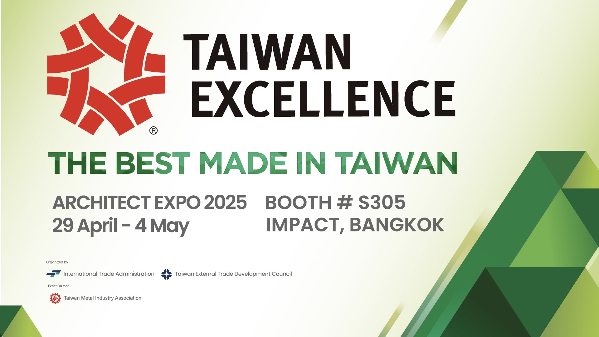 Taiwan Excellence เตรียมพลิกโฉมอนาคตของเทคโนโลยีการก่อสร้างที่ยั่งยืนในงาน ARCHITECT EXPO 2025 งานแสดงเทคโนโลยีการก่อสร้างชั้นนำของอาเซียน จัดขึ้นระหว่างวันที่ 29เมษายน ถึง พฤษภาคม 2568 ณ CHALLENGER Hall 3 ศูนย์แสดงสินค้าและการประชุม อิมแพ็ค เมืองทองธานี ที่บูธ S305