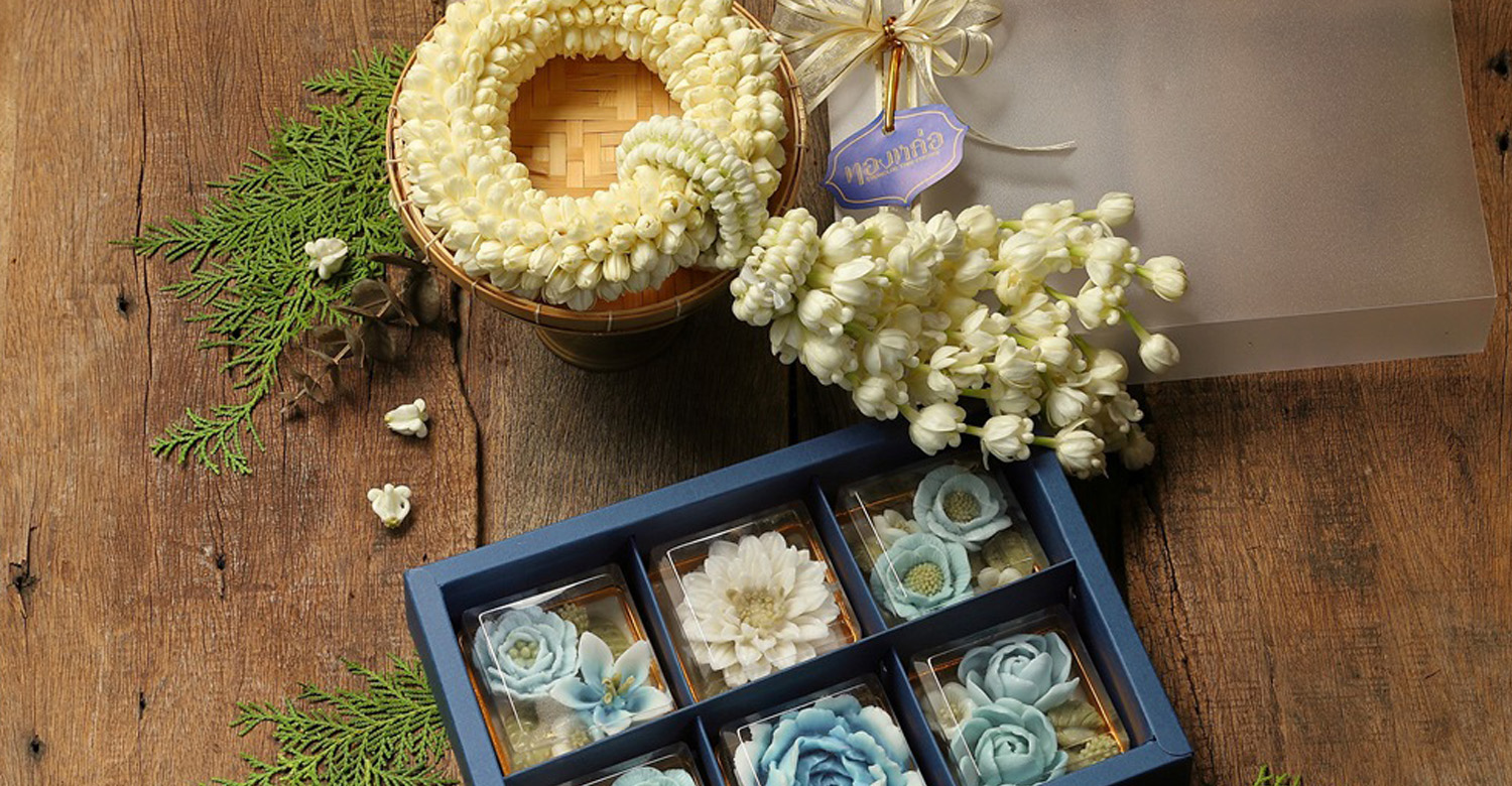 4. กล่องมะลิซ้อนบอกรัก กล่องขนมช่อมะลิสดบรรจุคู่กับมาลัยมะลิเกลียว กลิ่นหอม สำหรับความรักบริสุทธิ์และยาวนานไม่เสื่อมคลายของแม่ ราคา 3,690 บาท