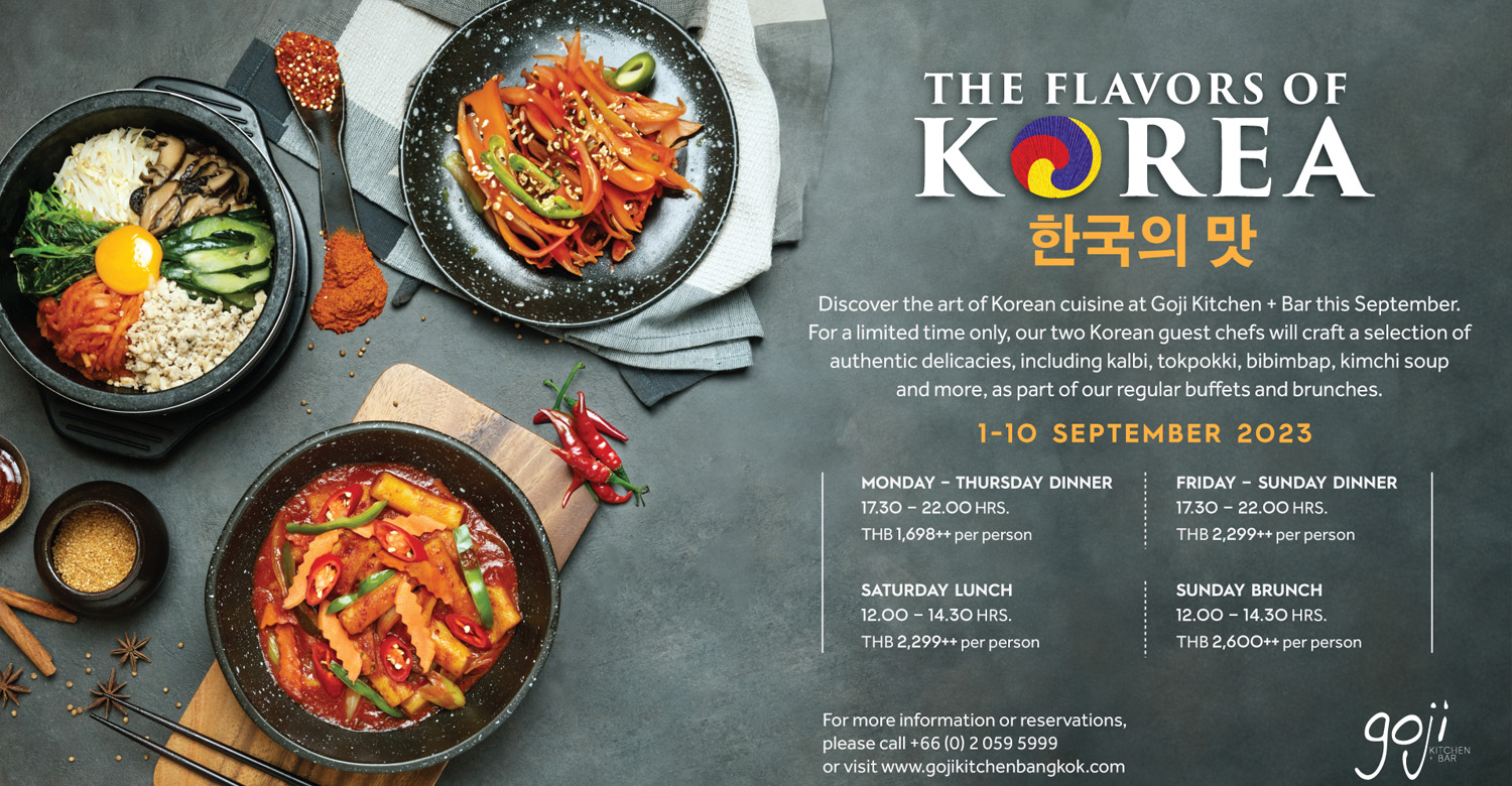 ตั้งแต่วันที่ 1-10 กันยายน ทุกท่านจะได้พบกับสองเชฟรับเชิญมากความสามารถจากประเทศเกาหลี เชฟยองราน แบค (Youngran Baek) และเชฟโซฮี ลี (Sohee Lee) ที่ห้องอาหารบุฟเฟ่ต์นานาชาติ โกจิ คิทเช่น + บาร์ ที่จะมารังสรรค์เมนูอาหารเกาหลีขึ้นชื่อ นำเสนอบนไลน์บุฟเฟต์อาหารมื้อเย็นทุกวันและมื้อกลางวันวันเสาร์และอาทิตย์ เริ่มต้นด้วยสเตชั่นพาริลลา กริลล์ ทุกท่านจะได้พบกับเมนู ซี่โครงเนื้อย่างปรุงรส (L.A. Kalbi)  หมูสามชั้นย่างซอสพริกแดง และ เนื้อสันในหมักซอสบูลโกกิ ต่อด้วยสเตชั่นซุป ที่พร้อมเสิร์ฟ ซุปโสมไก่เพื่อสุขภาพ และซุปกิมจิเต้าหู้หมูสามชั้นสไลด์ รสชาติกลมกล่อม นอกจากนี้ทุกท่านยังสามารถเพลิดเพลินไปกับเมนูยอดฮิตอย่าง ต๊อกบกกี ใส่แผ่นปลาและไข่นกกระทาในซอสพริกแดง ก๋วยเตี๋ยวเนื้อและเส้นบัควีท (เสิร์ฟเย็น) ที่มาพร้อมหัวไชเท้าหมัก แตงกวา และไข่ต้ม สำหรับคนรักแพนเค้กเกาหลีและของทอด พลาดไม่ได้กับเมนูที่รังสรรค์อย่างพิถีพิถันอย่าง ซีฟู้ดแพนเค้ก กิมจิแพนเค้ก เกี๊ยวทอดเสิร์ฟคู่หอมดองหมักซีอิ๊ว และเมนูข้าวยำเกาหลีรสเด็ดอย่าง บิบิมบับ เพื่อเพิ่มความกลมกล่อมและความอร่อยอย่างสมบูรณ์แบบให้กับอาหารเกาหลี ห้องอาหารโกจิ คิทเช่น + บาร์ พร้อมเสริมทัพด้วยเครื่องเคียงแสนอร่อยถึง 12 ชนิด ไม่ว่าจะเป็น จับแชหรือผัดวุ้นเส้นสไตล์เกาหลี ปูและกุ้งหมักซอสซีอิ๊ว บวบผัด  นาบัคกิมจิ สลัดกิมจิ รากไม้สมุนไพรย่างปรุงรส ปลาแอนโชวี่ผัดแตงกวากิมจิ และ อีกหลากหลายตัวเลือกผักสดท้องถิ่น ปิดท้ายด้วยของหวานเพิ่มความสดชื่นอย่างพันช์แตงโมมะนาวสูตรเกาหลี
