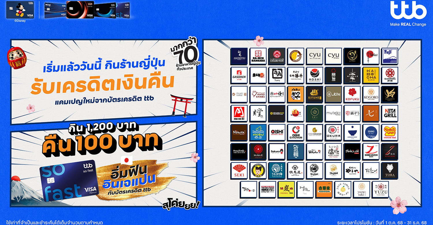 ทีเอ็มบีธนชาต หรือ ทีทีบีพร้อมเสิร์ฟความสุขเอาใจสายกินจริงจังให้ผู้ถือบัตรเครดิต ttb บัตรเครดิต ttb Global House และบัตรเครดิต ttb Disney ได้อิ่มอร่อยแบบจัดเต็มกับแคมเปญ “อิ่มฟิน อินเจแปน” กิน 1,200 บาทขึ้นไป / เซลล์สลิป รับเครดิตเงินคืน 100 บาท (จำกัดเครดิตเงินคืน 100 บาท / เซลล์สลิป และสูงสุด 400 บาท / ท่าน ตลอดรายการ) กับร้านอาหารญี่ปุ่นชื่อดังทั่วประเทศมากกว่า 70 ร้าน ให้ทุกมื้อเต็มไปด้วยความสุข ตอบทุกโจทย์ทุกความชอบ ทั้งซูชิ ราเมน ชาบู ปิ้งย่าง หรือบุฟเฟต์ คนรักอาหารญี่ปุ่นไม่ควรพลาด อิ่มอร่อย ได้ตั้งแต่วันที่ 1 ตุลาคม 2568 – 31 ธันวาคม 2568 สามารถศึกษารายละเอียดเพิ่มเติมของโปรโมชันได้ที่ https://www.ttbbank.com/th/promotion/credit-card/dining/japanese-theme-oct25
