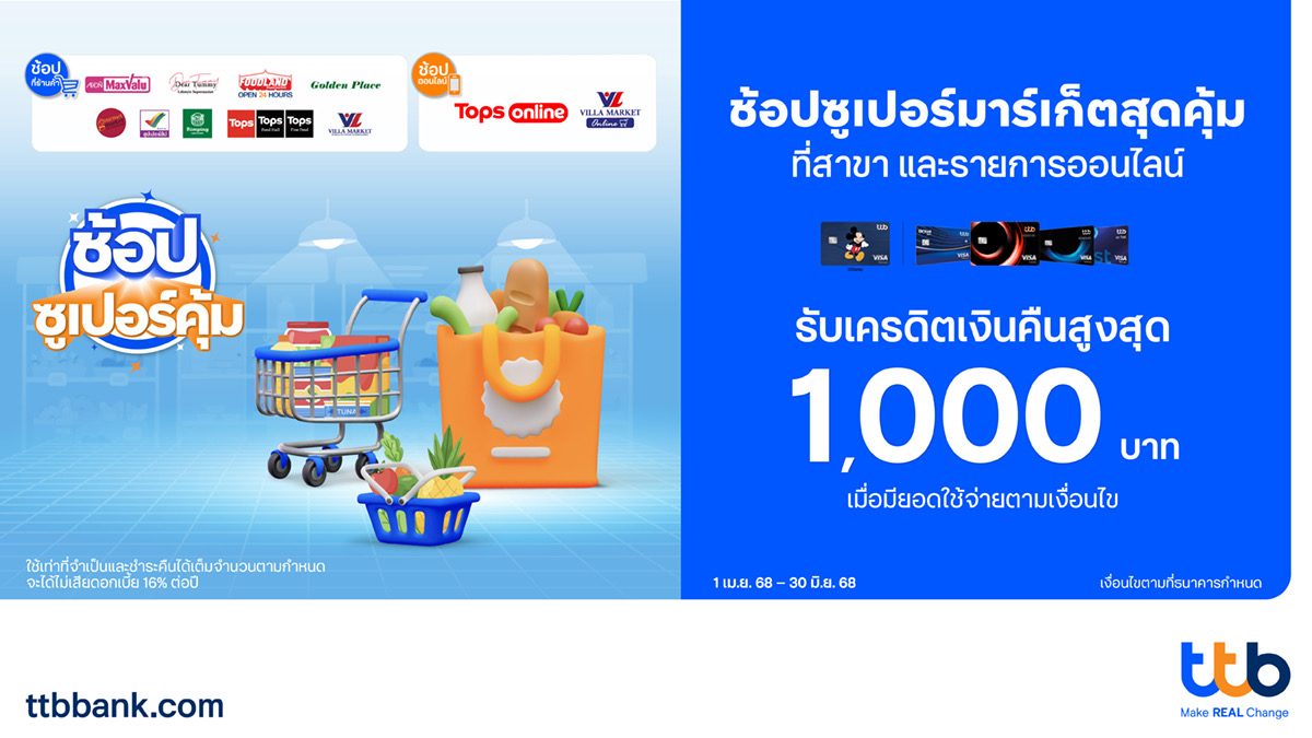 ทีเอ็มบีธนชาต หรือ ทีทีบี มอบสิทธิพิเศษให้ผู้ถือบัตรเครดิต ทีทีบี ได้รับความคุ้มค่าที่มากกว่ากับแคมเปญ “ช้อปซูเปอร์คุ้ม” รับเครดิตเงินคืนสูงสุดถึง 1,000 บาท / ท่าน เมื่อมียอดใช้จ่ายผ่านบัตรเครดิต ทีทีบี รีเซิร์ฟอินฟินิท ทีทีบี รีเซิร์ฟซิกเนเจอร์ ทีทีบี แอปโซลูท ทีทีบี โซสมาร์ท ทีทีบี โซชิลล์ ทีทีบี โกลบอลเฮาส์ ทีทีบี รอยัลทอปบราส และทีทีบี ดิสนีย์ แบบชำระเต็มจำนวน ณ ซูเปอร์มาร์เก็ตที่สาขา และซูเปอร์มาร์เก็ตออนไลน์ที่ร่วมรายการ ตั้งแต่วันที่ 1 เมษายน 2568 – 30 มิถุนายน 2568โดยยอดใช้จ่าย 1,500 – 4,999 บาท รับเครดิตเงินคืน จำนวน 30 บาท ยอดใช้จ่าย 5,000 – 14,999 บาท รับเครดิตเงินคืน จำนวน 120 บาท และยอดใช้จ่ายตั้งแต่ 15,000 บาทขึ้นไป รับเครดิตเงินคืนจำนวน 500 บาท สามารถศึกษารายละเอียดเพิ่มเติมของโปรโมชัน ได้ที่https://www.ttbbank.com/th/promotion/detail/supermarket-apr25