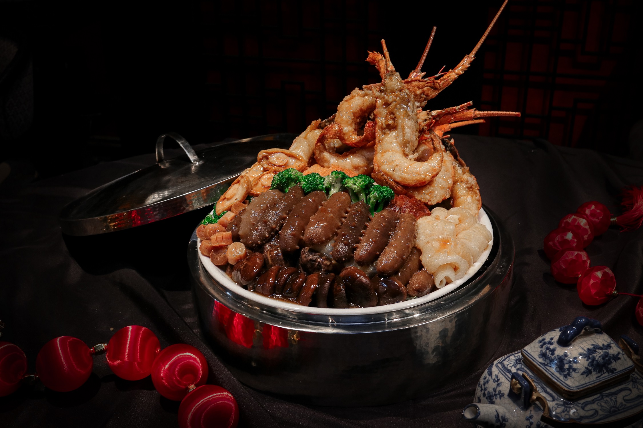 ส่วนผสมสำหรับซุปมงคลนี้ เชฟบรูซคัดสรรด้วยตนเองอย่างพิถีพิถัน เพื่อให้มั่นใจว่าซุปหม้อนี้จะไม่เพียงมงคลแต่ชื่อ แต่ยังนำสุขภาพที่ดีมาสู่ลูกค้าทุกท่านอีกด้วย สำหรับเป๋าฮื้อที่หมายถึง ‘อนาคตที่สดใส’ เชฟเลือกเป๋าฮื้อออสเตรเลีย เนื่องจากเป็นเป๋าฮื้อที่โตในแหล่งน้ำเย็น อุดมด้วยสาหร่ายและวงจรธรรมชาติที่สมบูรณ์ ภูเก็ตล็อบสเตอร์ ราชาแห่งกุ้งที่มีความหมายถึงความเจริญรุ่งเรือง และยศตำแหน่ง ปลิงทะเลจากประเทศจีน ที่เปรียบเสมือนสัญลักษณ์แห่งความสุข ส่วนหอยเชลล์แห้ง อาหารจักรพรรดิมาแต่โบราณ เชฟบรูซเลือกหอยเชลล์แห้งจากประเทศจีน ด้วยรูปร่างเป็นก้อนคล้ายคลึงกับเงินจีนในสมัยโบราณ หอยเชลล์ทั้งแบบแห้งและแบบสดจึงถือเป็นสัญลักษณ์แห่งความมั่งคั่ง เพื่อความกลมกล่อมยิ่งขึ้นเชฟบรูซเลือกกระเพาะปลาสดที่สื่อความหมายถึงความอุดมสมบูรณ์ กระเพาะปลาสดนั้นสูงด้วยโปรตีน เสริมสร้างภูมิคุ้มกัน และซ่อมแซมส่วนที่สึกหรอของร่างกายได้ดี ส่วนผสมทั้งหมดตุ๋นในซุปไก่เข้มข้นพร้อมเห็ดหอม เนื่องจากซุปมงคลนิยมทำเป็นหม้อขนาดใหญ่ จึงเหมาะสำหรับการเลี้ยงสังสรรค์เป็นกลุ่มหรือสังสรรค์แบบครอบครัว