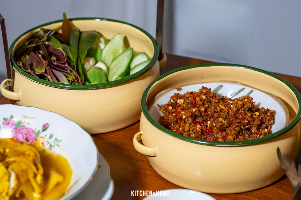 น้ำพริกปลาทราย (เมนูซิกเนเจอร์) เมนูนี้ฉีกทุกตำราน้ำพริก! เชฟต้องการให้ปลาทรายมีเท็กซ์เจอร์ที่แตกต่าง จึงนำเนื้อปลาไปนึ่ง แกะเอาแต่เนื้อจากนั้นนำไปโขลกจนฟูละเอียด จากนั้นนำไปผัดกับเครื่องแกงเพื่อไล่ความชื้น เพื่อให้เนื้อปลามีความกรอบ จากนั้นนำไปผัดต่อกับน้ำมะขาม เพื่อให้ได้รสชาติเปรี้ยวนำหวานตาม กินคู่กับผักพื้นบ้านสดๆ อร่อยจนหยุดไม่ได้