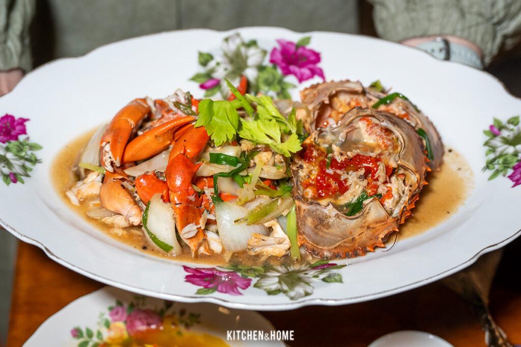 ปูดำผัดต้นหอม รสชาติเค็มนำ หอมกลิ่นเหล้าจีน และได้ความเผ็ดร้อนจาก พริกไทยดำปะเหลียน ที่สำคัญคือการคัดสรร ปูน้ำใหญ่ (ปูที่เนื้อแน่นที่สุดในช่วงน้ำขึ้น 15 ค่ำ) และทางร้านจัดการแกะเนื้อปู ให้พร้อมกิน เพื่อให้ลูกค้าได้อร่อยอย่างเต็มที่โดยไม่ต้องเลอะมือ