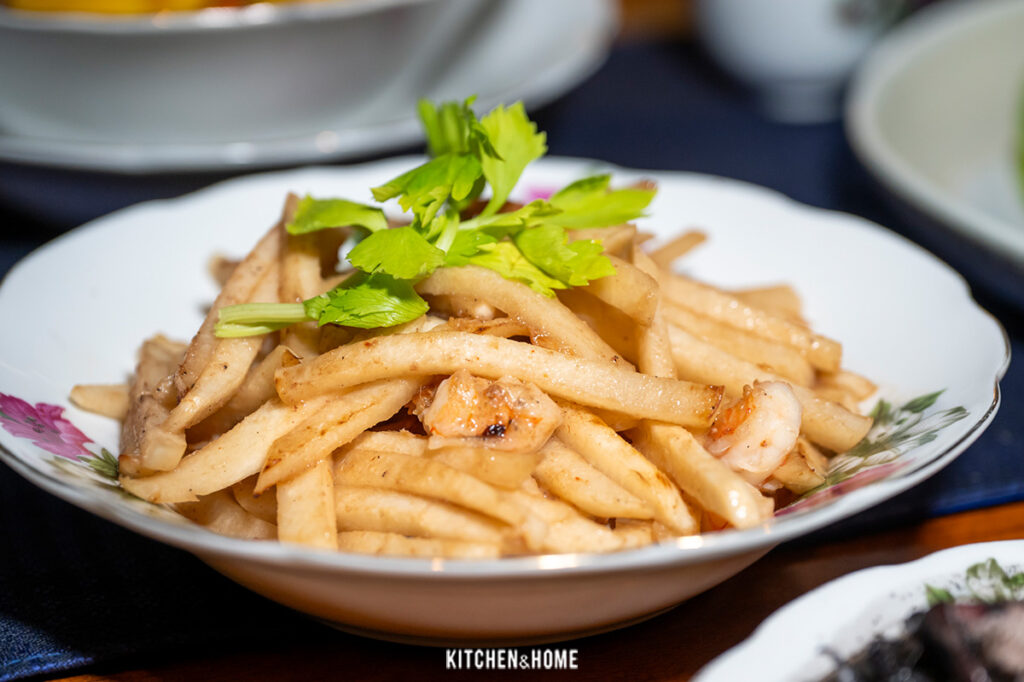 ผัดมันแกวกุ้งสด นำมันแกวหวานกรอบมาผัดกับกะปิและกุ้ง ทำให้ได้รสชาติที่ลงตัวและหอมกลิ่นกะปิ เมนูนี้เข้ามาช่วยตัดความเผ็ดของอาหารใต้ได้ดีไม่น้อย
