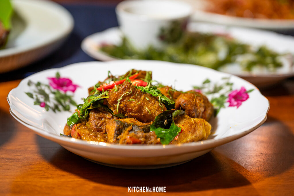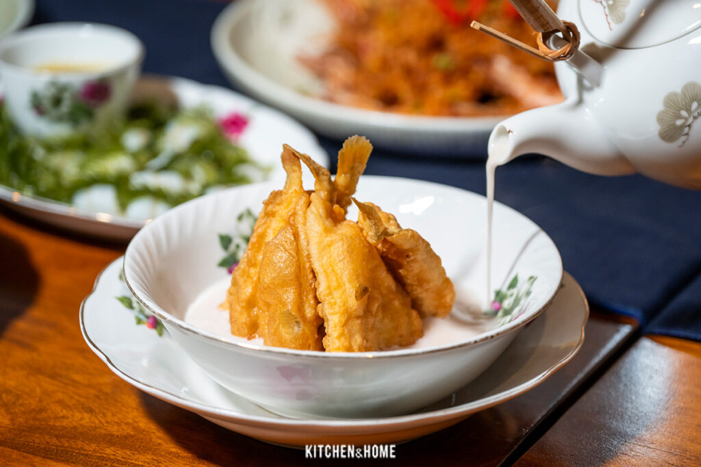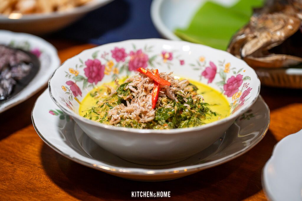 ต้มกะทิปลาทรายใบแมงลัก เมนูนี้ปกติแล้วคนในท้องถิ่นใช้ปลาทรายสดในการทำต้มกะทิ แต่เชฟดัดแปลงเพื่อแก้ปัญหาเนื้อปลาที่มักจะเละจากการต้มจึงนำปลาทรายไป ทอดแบบเทมปุระ ให้ได้ความกรอบนอก ก่อนนำกะทิหอมๆ มาปรุงรสและราดลงไป ทำให้ได้ความอร่อยที่หลากหลายเท็กซ์เจอร์ในคำเดียว