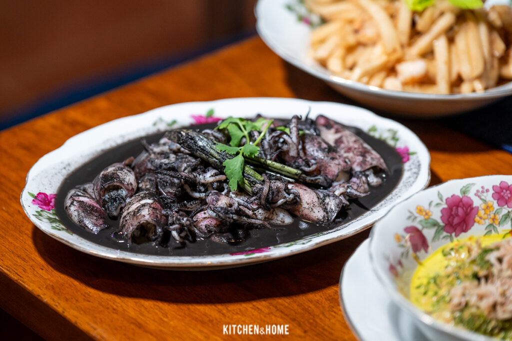 หมึกน้ำดำ ใช้หมึกสดมากๆ ทำให้เวลาผัดไม่ต้องเติมน้ำเลย น้ำหมึกจะออกมาเองตามธรรมชาติ ปรุงรสหวานนำนิดๆ เป็นจานเรียบง่ายที่โชว์ความสดใหม่ของวัตถุดิบได้ดีที่สุด