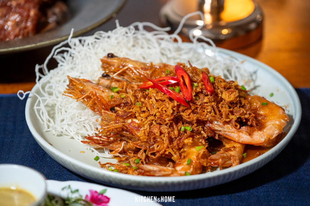 กุ้งผัดซอสมะขาม เมนูนี้มีเฉพาะช่วง มรสุม เท่านั้น เพราะเป็นช่วงที่กุ้งทะเลเข้าใกล้ฝั่ง เชฟนำกุ้งมาทอดให้กรอบ แล้วคลุกเคล้ากับซอสมะขามรสหวานนำเปรี้ยวตามที่ปรุงอย่างพิถีพิถัน กินกับหมี่กรอบแล้วอร่อยเข้ากันสุดๆ