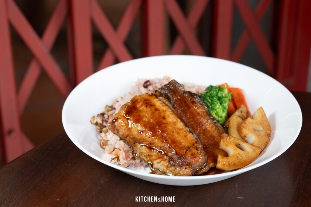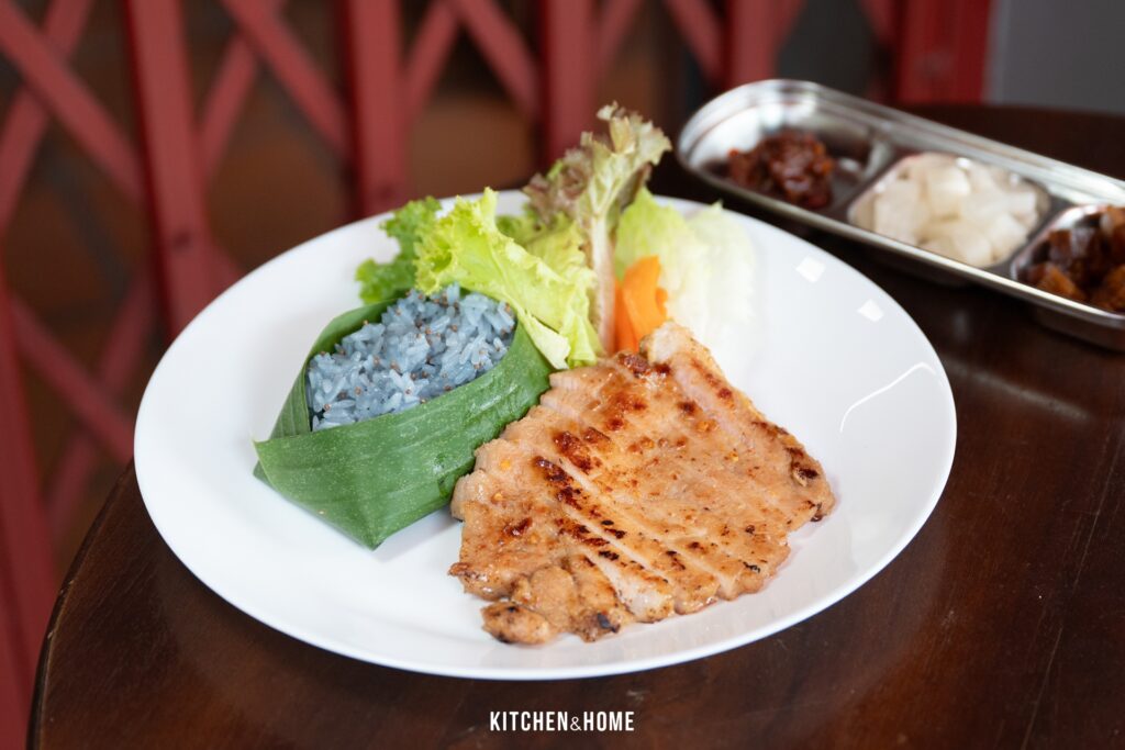 อีกเมนูสำหรับคนชอบกินข้าวแนะนำ ข้าวธัญพืชปลาดุกย่างซอสเทอริยากิโคโคนัตอะมิโน ใช้เนื้อปลาดุกไทยที่มีโอเมกา-3 ผ่านการล้างทำความสะอาดอย่างดีจนไร้กลิ่นคาว แล่เอาแต่เนื้อแล้วย่างจนหอม ทาซอสเทอริยากิสูตรเฉพาะของร้าน มีส่วนผสมโคโคนัทอะมิโน ช่วยเพิ่มกรดอะมิโนที่ดี เสิร์ฟพร้อมข้าวธัญพืชและผักย่าง ข้าวเหนียวสมุนไพรหมูย่าง มีข้าวเหนียวหลากชนิดด้วยกัน อาทิ ข้าวเหนียวอัญชัน ข้าวเหนียวดอกคำฝอยผสมงาขี้ม้อน ข้าวเหนียวก่ำ กินคู่กับเนื้อหมูสันนอกมันน้อย หมักซอสจนนุ่ม แนมด้วยผักสด น้ำพริก และเครื่องเคียงไชเท้าดอง 2 สี โดยไชเท้าสีดำมีส่วนผสมของน้ำส้มสายชูดำหมักตามกรรมวิธีโบราณจากเบตง ช่วยแก้เลี่ยน ตัดรสได้ดี พร้อมทั้งมีโปรไบโอติกส์ที่ดีต่อลำไส้อีกด้วย