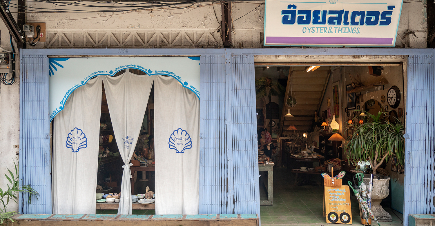 มาแล้วอย่าลืมแวะไป Oyster and Things. ร้านของแต่งบ้านและสารพันของกุ๊กกิ๊ก ซึ่งเปิดเป็นสาขาที่ 2 ในอาคารเก่า โดยยังคงโครงสร้างแบบเดิมๆ ไว้ โดดเด่นด้วยประตูเหล็กยืดสีฟ้าพาสเทลสดใส พร้อมป้ายชื่อร้าน “อ๊อยสเตอร์”ดีไซน์สุดคลาสสิก