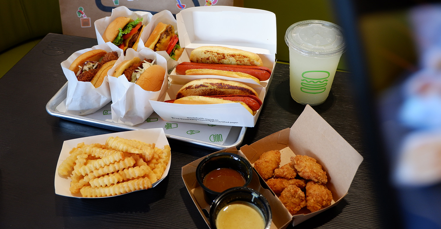 เมนูฮอตฮิตที่ได้รับความนิยมอย่าง แช็คเบอร์เกอร์ ที่เป็นชีสเบอร์เกอร์และเนื้อแองกัส 100% ใส่ผักกาดหอม มะเขือเทศ และ ShackSauce สูตรเฉพาะ