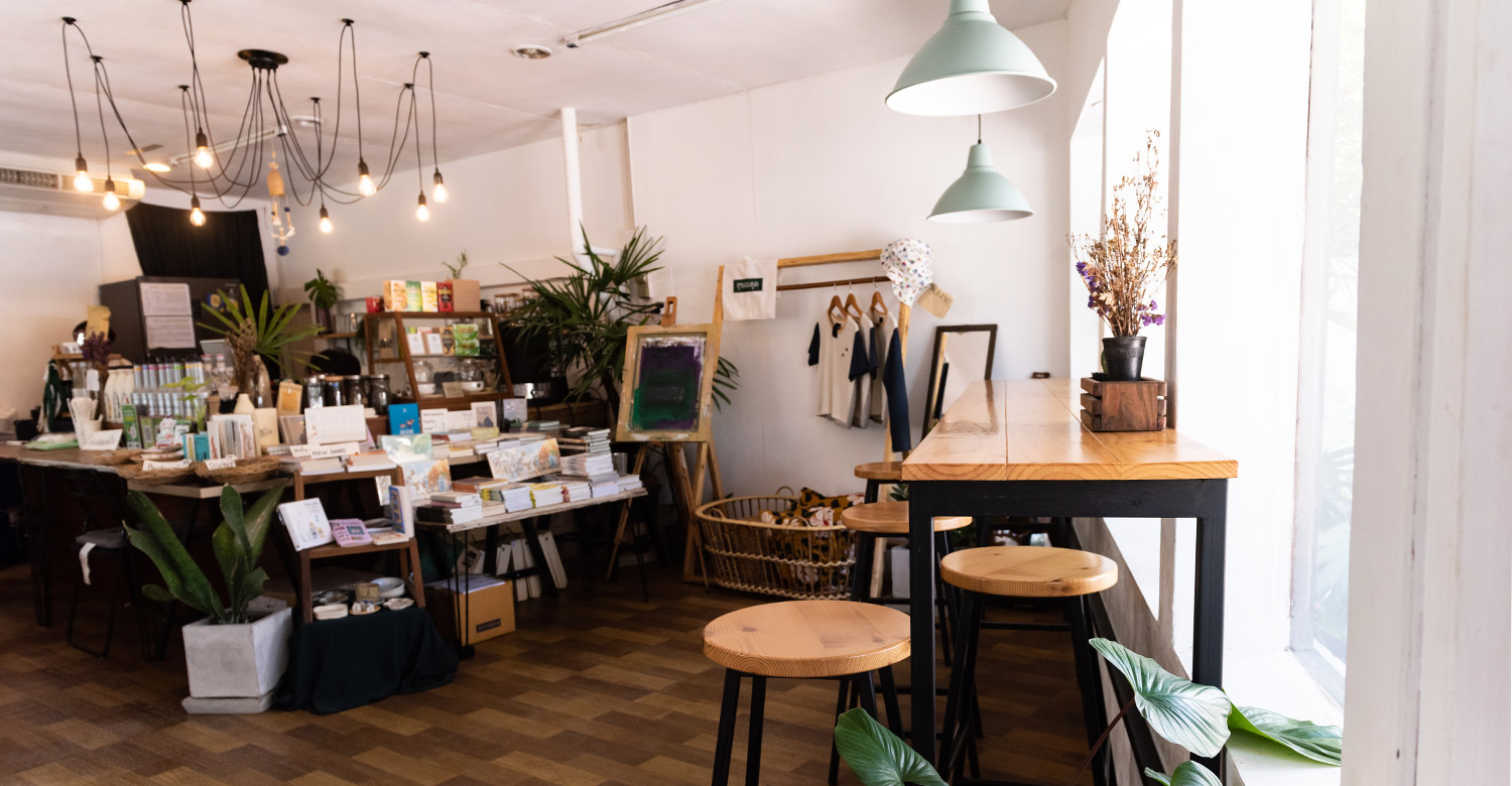 เมื่ออยากให้สเปซแห่งนี้เป็นคาเฟ่สำหรับให้ทุกคนมานั่งเล่น ปล่อยใจสบายๆ ภายในร้านจึงตกแต่งอย่างง่ายๆ ด้วยโทนสีขาวและงานไม้ มีมุมขายหนังสือจากสำนักพิมพ์ต่างๆ อาทิ สำนักพิมพ์แซลมอน, 10 มิลลิเมตร และฟูลสต๊อป นอกจากนี้ยังมีสินค้าเล็กๆ น้อยๆ วางขายอย่างเสื้อผ้า งานเซรามิก งานคราฟต์ งานแฮนด์เมด และมักจะมีผักสดปลอดสารรวมไปถึงเมนูสุขภาพพร้อมเสิร์ฟจากไร่และสวนต่างๆ แวะเวียนมาให้อุดหนุนกันอยู่เรื่อยๆ อีกด้วย
