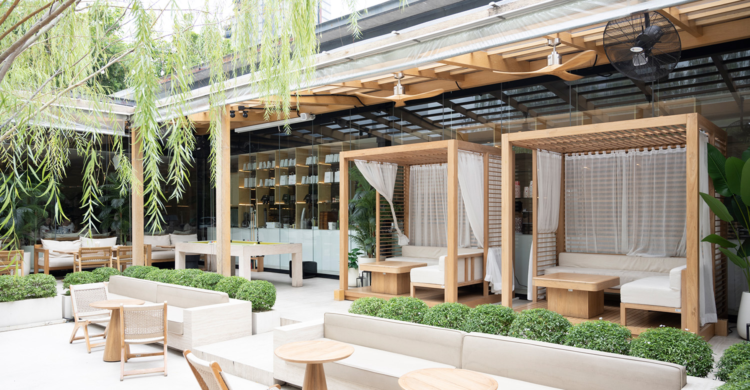 พื้นที่โซน Outdoor ที่มีคาบานา และ seating อยู่ล้อมรอบบ่อน้ำพุใจกลาง space ในโซนนี้จะมีโต๊ะพูลให้บริการฟรี รวมไปถึงจอ Projector ที่เปิดฉายหากมีกีฬาแมชสำคัญ