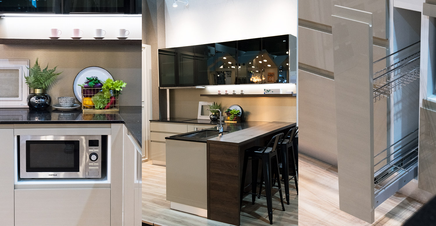 สำหรับชุดครัวนี้ออกแบบแปลนครัวเป็นรูปตัว L บิลต์อินเตาไฟฟ้า เครื่องดูดควัน และอ่างล้างจานเข้ากับชุดครัว ทำให้สามารถใช้งานพื้นที่ส่วนเตรียม ส่วนปรุง และส่วนล้างได้อย่างต่อเนื่องคล่องตัว มาพร้อมฟังก์ชันจัดเก็บที่ออกแบบให้เหมาะสมกับขนาดพื้นที่ไม่ว่าจะเป็นตู้แขวนด้านบน หรือช่องและลิ้นชักใต้เคาน์เตอร์ที่สามารถเก็บของได้อย่างจุใจ เต็มพื้นที่ อีกทั้งยังดีไซน์ให้มีชั้นสำหรับวางของตกแต่ง โชว์ของสะสม ตลอดจนของที่หยิบใช้งานบ่อยๆ