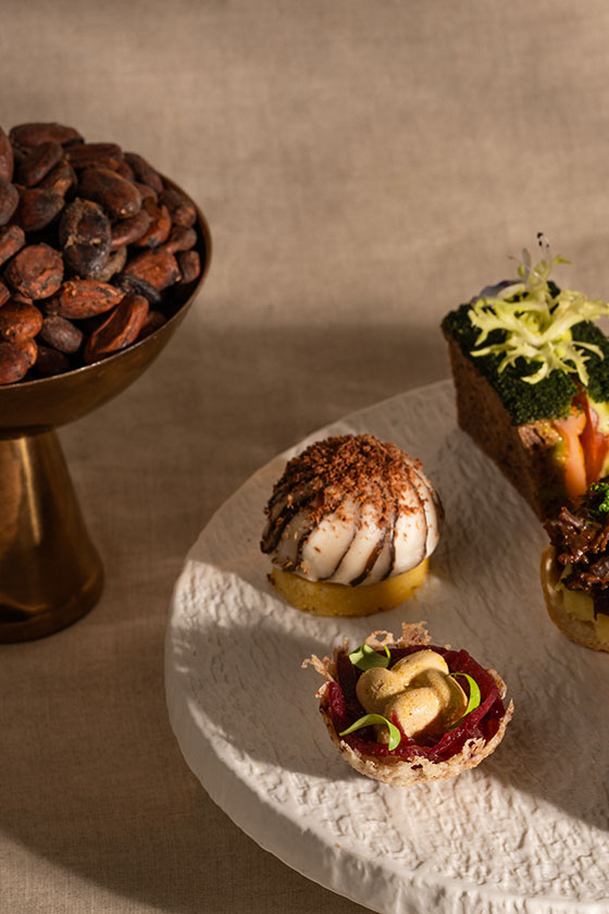 เชฟเอ๋ กล่าวถึงแรงบันดาลใจว่า “สำหรับอาร์ฟเตอร์นูนทีเซ็ตนี้ ผมตั้งใจร้อยเรียงรสชาติของช็อกโกแลตจากหลากหลายแหล่งกำเนิดเพื่อสร้างสมดุลอันสมบูรณ์แบบ เราเริ่มต้นจากช็อกโกแลตไทยจากชลบุรีที่มีเสน่ห์เฉพาะตัว ผสานเข้ากับมิติของช็อกโกแลตระดับสากลจากบราซิลและสาธารณรัฐโดมินิกัน เพื่อมอบประสบการณ์ที่เป็นนานาชาติอย่างแท้จริง เราต้องการนำเสนอเรื่องราวของช็อกโกแลตให้ครบทุกมิติทั้งในเมนูของหวานและของคาว ผสมของคาเคานิบส์หรือช็อกโกแลตแทรกซึมอยู่ ไม่ว่าจะเป็นขนมปังช็อกโกแลตบริยอช หรือการขูดช็อกโกแลตโรยหน้า เพื่อให้ทุกท่านได้สัมผัสรสชาติอันซับซ้อนของช็อกโกแลตอย่างเต็มเปี่ยม ไปจนถึงรสเปรี้ยวบางๆ ที่ซ่อนอยู่ในตอนท้ายซึ่งเป็นเอกลักษณ์อันน่าค้นหา”