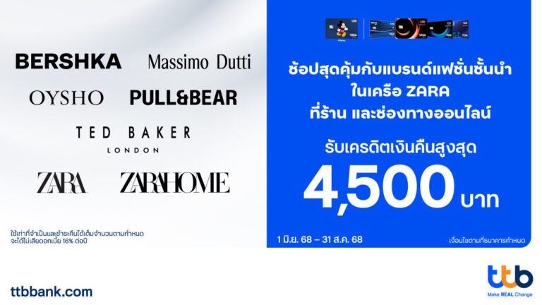 News บัตรเครดิต ttb มอบเครดิตเงินคืนสูงสุด 4,500 บาท เมื่อช้อปปิ้งแบรนด์ชั้นนำในเครือ Zara 2 กรกฎาคม 2025