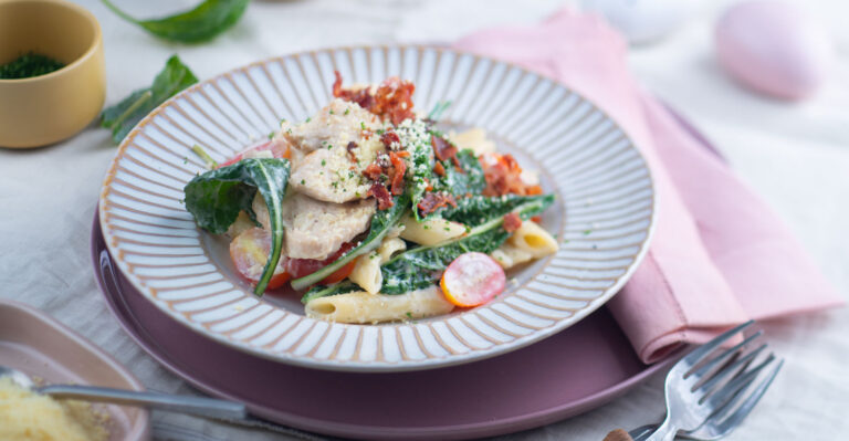 พาสต้าอกไก่ครีมซอส ทำง่ายได้สุขภาพด้วยผักเคลและมะเขือเทศ