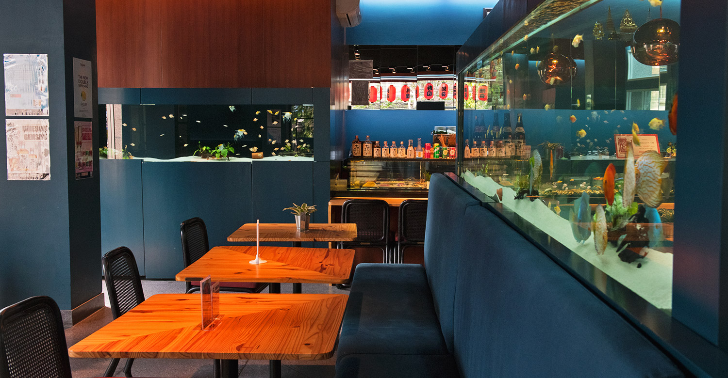 ชวนตื่นตากับตู้ปลาขนาดใหญ่และการตกแต่งผนังสีน้ำเงินเข้มที่ให้บรรยากาศเหมือนอยู่ใต้ทะเลลึก ทั้งยังสร้างสีสันให้กับร้านอาหารญี่ปุ่นย่านลาดยาวแห่งนี้