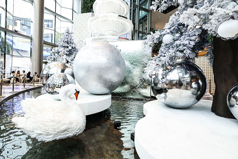 พื้นที่บริเวณ JEWEL ชั้น M เนรมิตให้กลายเป็น “Fountain of Wonder” น้ำพุคริสตัลกำลังไหลลงสู่ด้านล่างดงามราวกับหยุดเวลาไว้ สื่อถึงแหล่งพลังแห่งชีวิตและความอัศจรรย์ในโลกอันเงียบสงบ เปล่งประกายระยิบระยับดั่งเกล็ดน้ำแข็งที่สะท้อนแสงแห่งความสุขในช่วงเทศกาลได้อย่างงดงามเหนือจินตนาการ รายล้อมด้วยต้นคริสต์มาสที่ถูกปกคลุมด้วยเกล็ดหิมะสีขาว และลูกบอลขนาดใหญ่ในโทนสี ขาว และ เงิน กลายเป็นภาพของป่าหิมะเหนือกาลเวลาที่ถูกแวดล้อมด้วยมนต์ขลังแห่งเทศกาล พร้อมด้วยเหล่าหงส์ขาวที่ลอยอยู่เหนือผืนน้ำ เพิ่มกลิ่นอายแห่งความโรแมนติกราวกับอยู่ในเทพนิยายฤดูหนาว