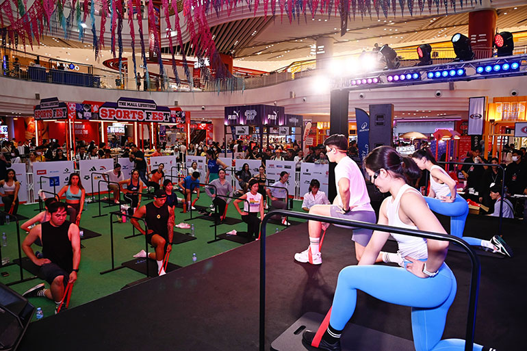 บรรยากาศภายในงาน  “THE MALL LIFESTORE SPORTS FEST”  วันแรกคับคั่งไปด้วยคนรักการออกกำลังกาย และแฟชั่นสปอร์ต มาร่วมอัพเดทเทรนด์และลงทะเบียนร่วมคลาสออกกำลังกาย โดยผู้เชี่ยวชาญจากแบรนด์พาร์ทเนอร์ชื่อดัง อาทิ FITNESS FIRST กับคลาสคาร์ดิโอสุดฮิตในช่วงเวลานี้ ได้แก่ HYROX FOUNDATION ,  HYROX ENGINE และ   HIIT x FUSION   พร้อมมาเปิดประสบการณ์กับคลาสมวยไทยจาก  FAIRTEX นำทีมโดย ครูตุ้ม ปริญญา และ ร่วมขยับอย่างมีสไตล์กับ CURVE BKK กับคลาส CARDIO BARRE และ STRETCHING โดยครูกอบัว และครูแนน ชลิตา