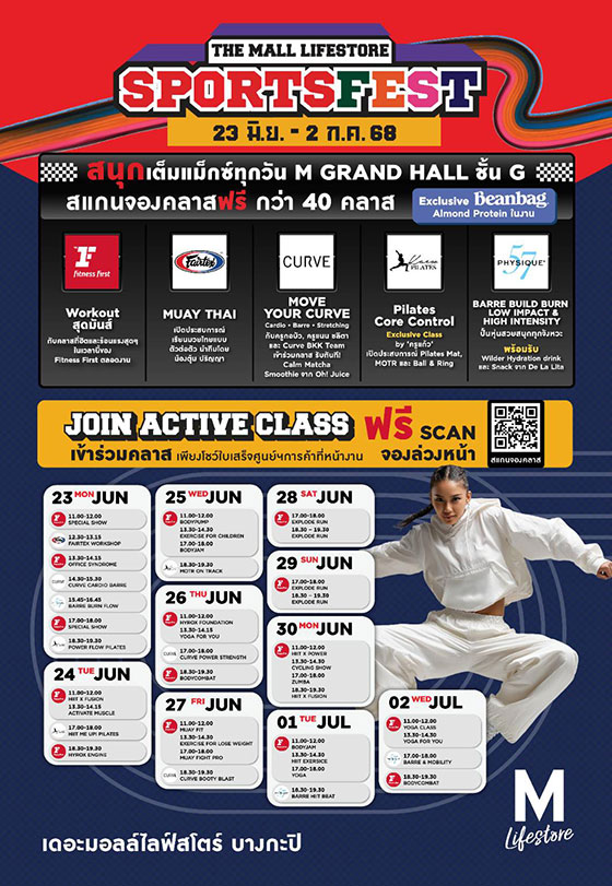 ผู้ที่สนใจร่วมแอคทีฟคลาสฟิตเนส ภายในงาน THE MALL LIFESTORE SPORTS FEST  เพียงเป็นสมาชิก M Card  ก็สามารถจองคลาสล่วงหน้า ที่จุดรับลงทะเบียนภายในงาน หรือ Line @Mcard  http://mcard.to/2wHbv1 พร้อมโชว์ใบเสร็จการใช้จ่ายภายในศูนย์ฯ ก่อนเข้าคลาส (ไม่จำกัดยอดใช้จ่าย) ได้ตั้งแต่วันนี้  – 2 กรกฎาคม 2568  ติดตามรายละเอียดโปรโมชั่นเพิ่มเติมได้ที่ FACEBOOK : SPORTSMALLTHAILAND  และ FACEBOOK : THE MALL GROUP
