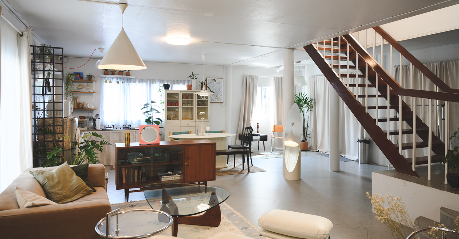 “ส่วนการตกแต่งภาพรวมจะเป็นสไตล์ Scandinavian Mid-Century Modern ดูมีสีสันและให้ความรู้สึกอบอุ่น เฟอร์นิเจอร์ส่วนใหญ่จะมาจากบ้านของพี่เซฟซึ่งเป็นบ้านที่อยู่กันมาตั้งแต่สมัยคุณปู่คุณย่า จะมีเฟอร์นิเจอร์เก่าๆ เยอะ เราก็ไปเลือกไปดูว่าชิ้นไหนสามารถนำมาทำใหม่หรือยังใช้งานได้อยู่บ้าง ประกอบกับญาติพี่เซฟทำโรงงานเฟอร์นิเจอร์ก็จะส่งให้เขาช่วยซ่อม ช่วยทำสีให้ใหม่ นอกจากนี้จะซื้อจากร้านมือสองกับทางออนไลน์บ้าง ถึงจะทำเป็นสตูดิโอด้วยแต่เราเลือกของทุกชิ้นเหมือนซื้อให้บ้านตัวเองจริงๆ จะเลือกจากความชอบของเราทั้งคู่เป็นหลัก”